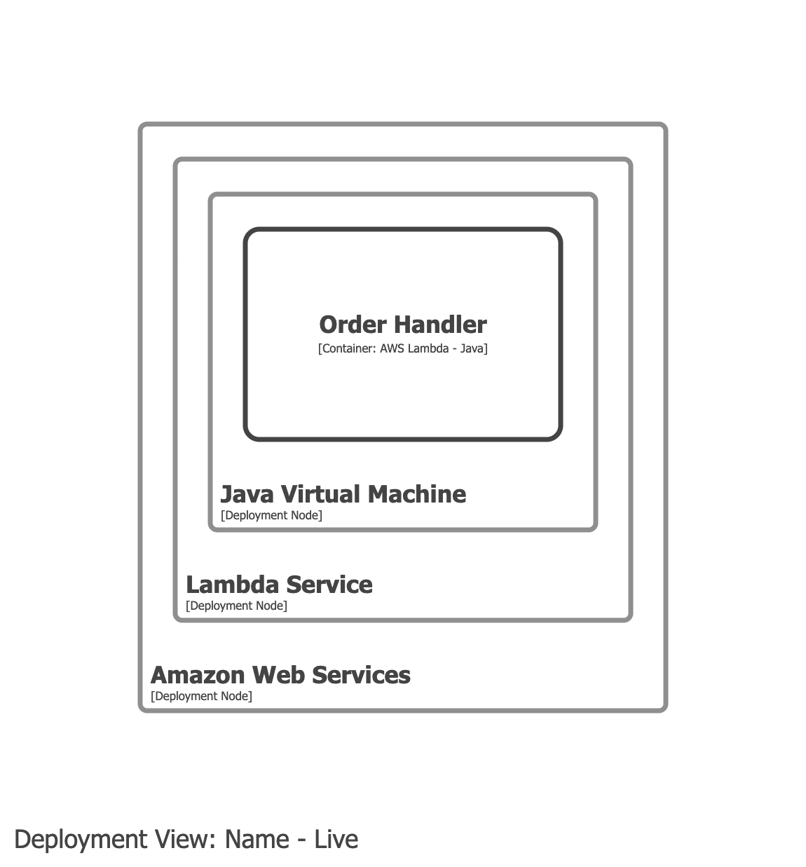 In the development deployment environment, model the local services as a collection of nested deployment nodes. This example includes the Java Virtual Machine that the handler runs inside, but you can omit this for a simpler diagram.