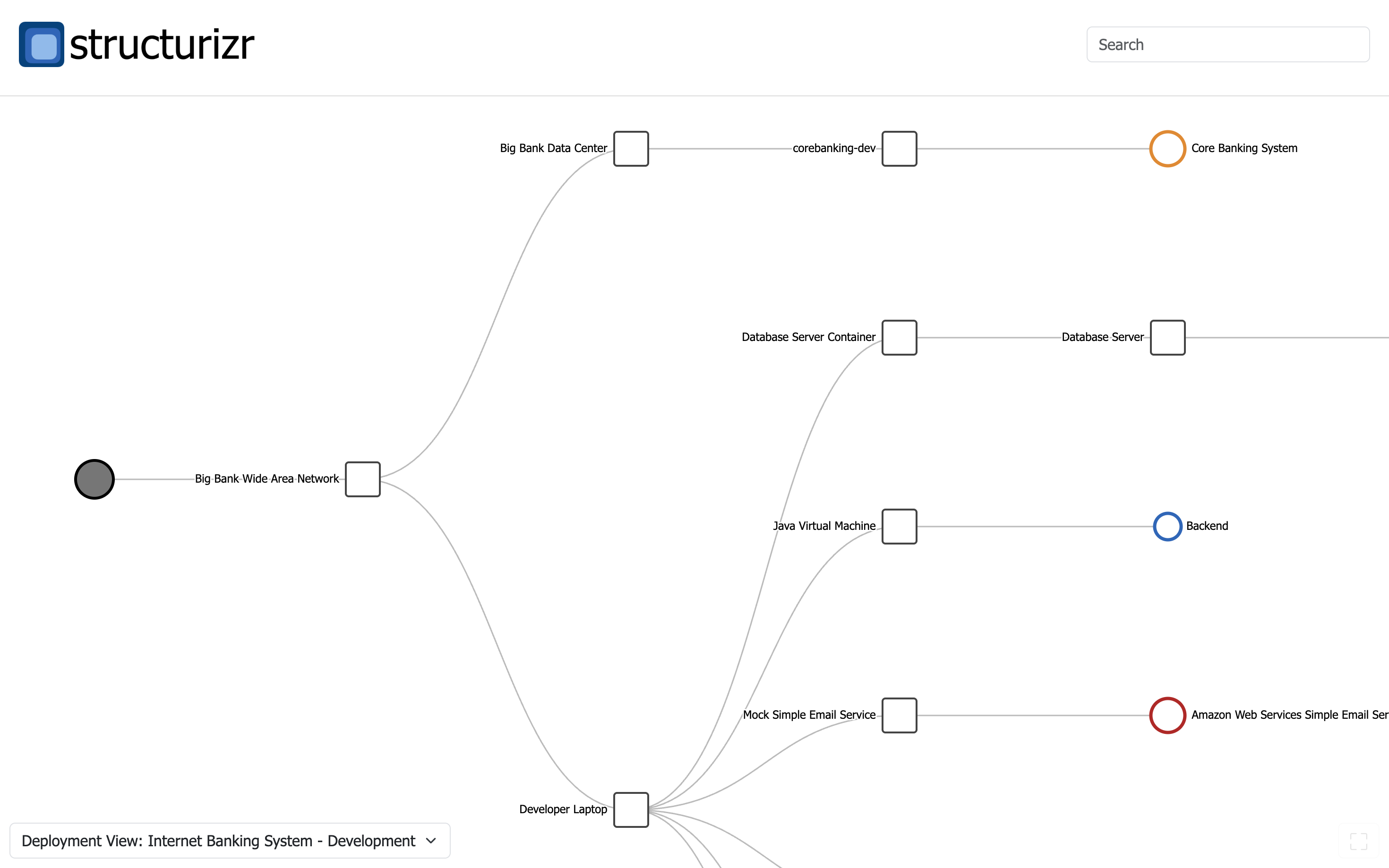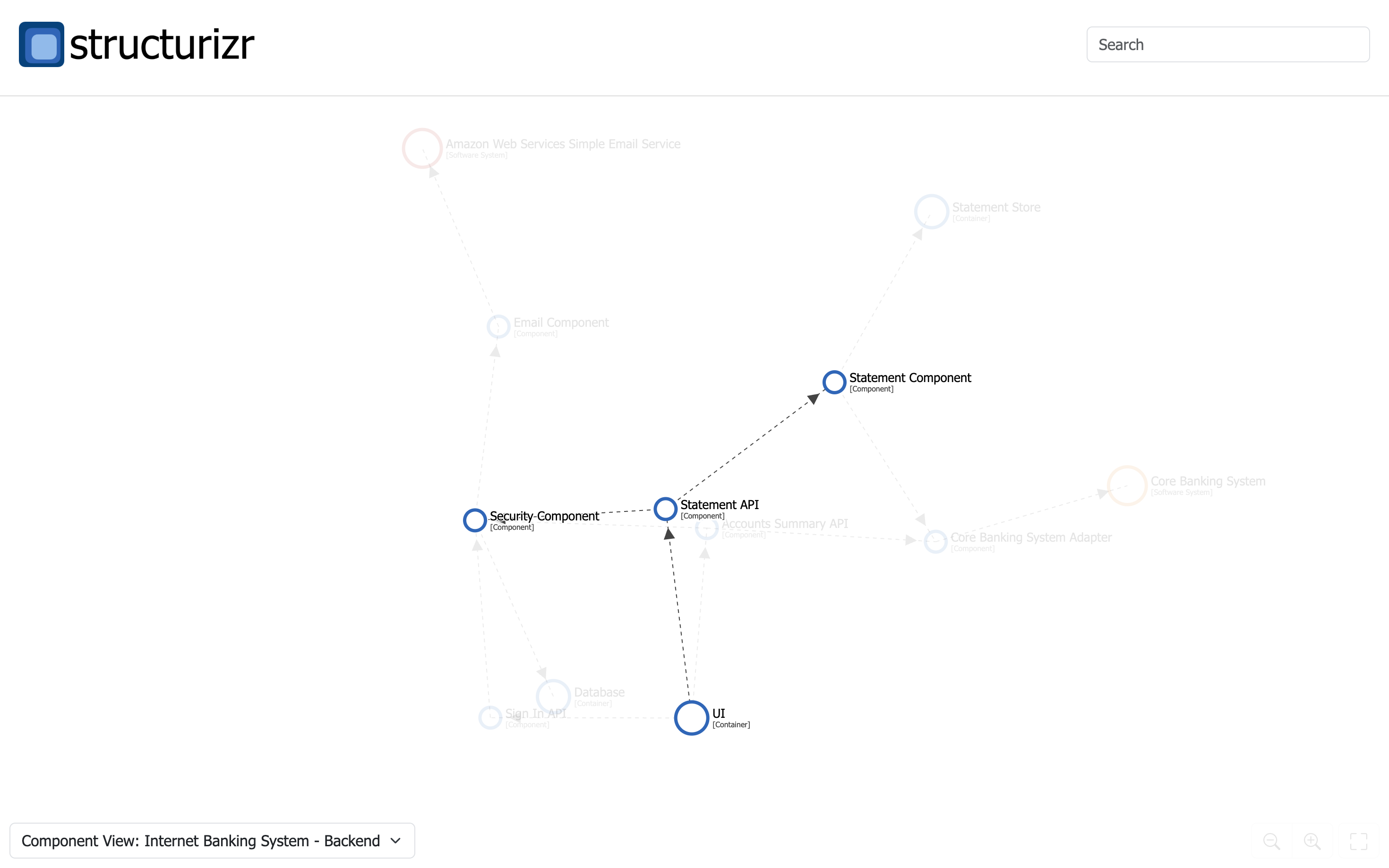 A number of additional visualisations are available, which allow you to explore the structure of the underlying software architecture model. To access them, click the button while viewing a diagram, or the “Explore” link on the workspace summary page.