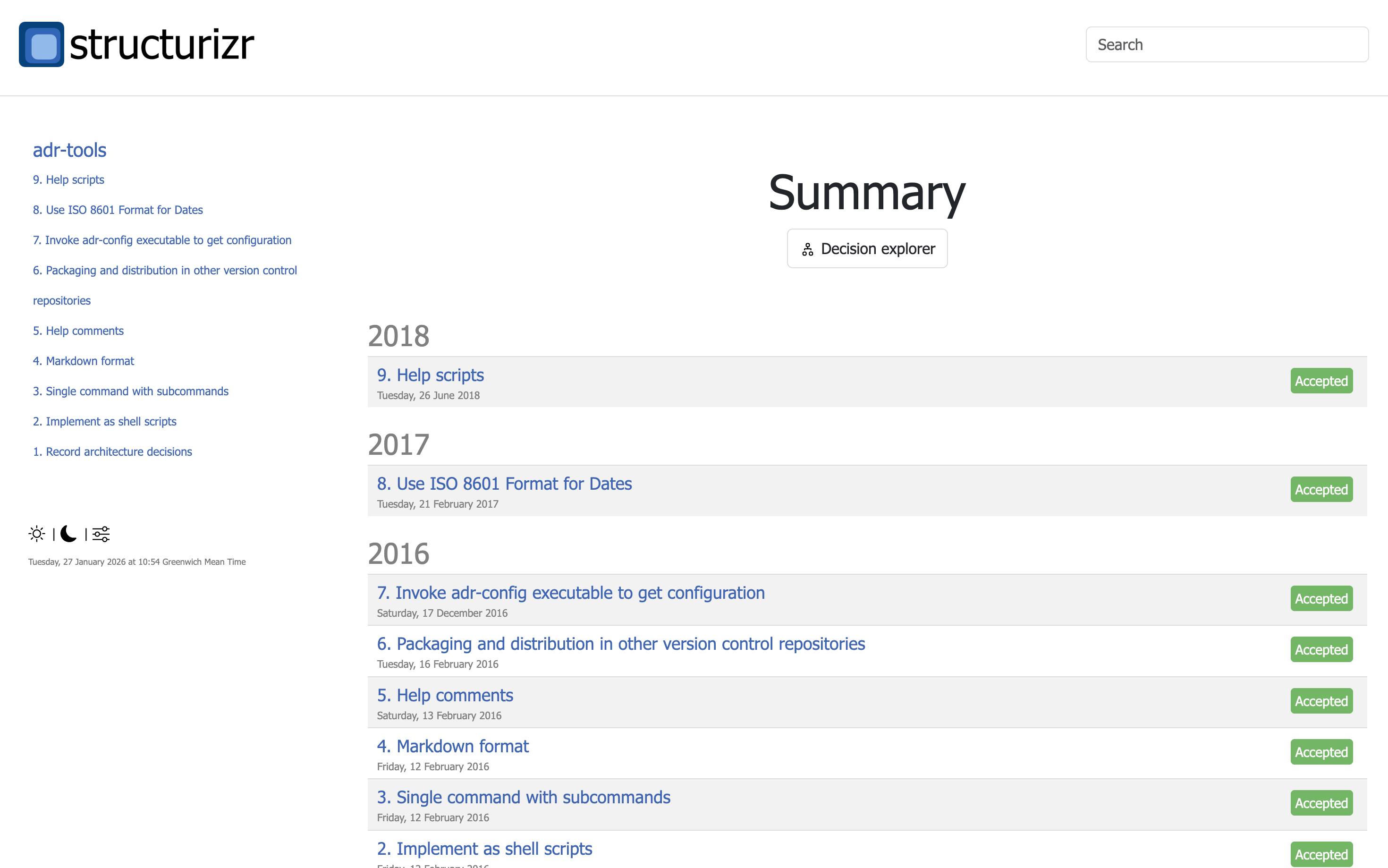 Structurizr allows you to supplement your software architecture model with a decision log, captured as a collection of lightweight Architecture Decision Records (ADRs) as described by Michael Nygard, and featured on the ThoughtWorks Technology Radar. ADRs are rendered by Structurizr, providing team members an “at a glance” view of the current set of ADRs, along with facilities to make navigating them easier.