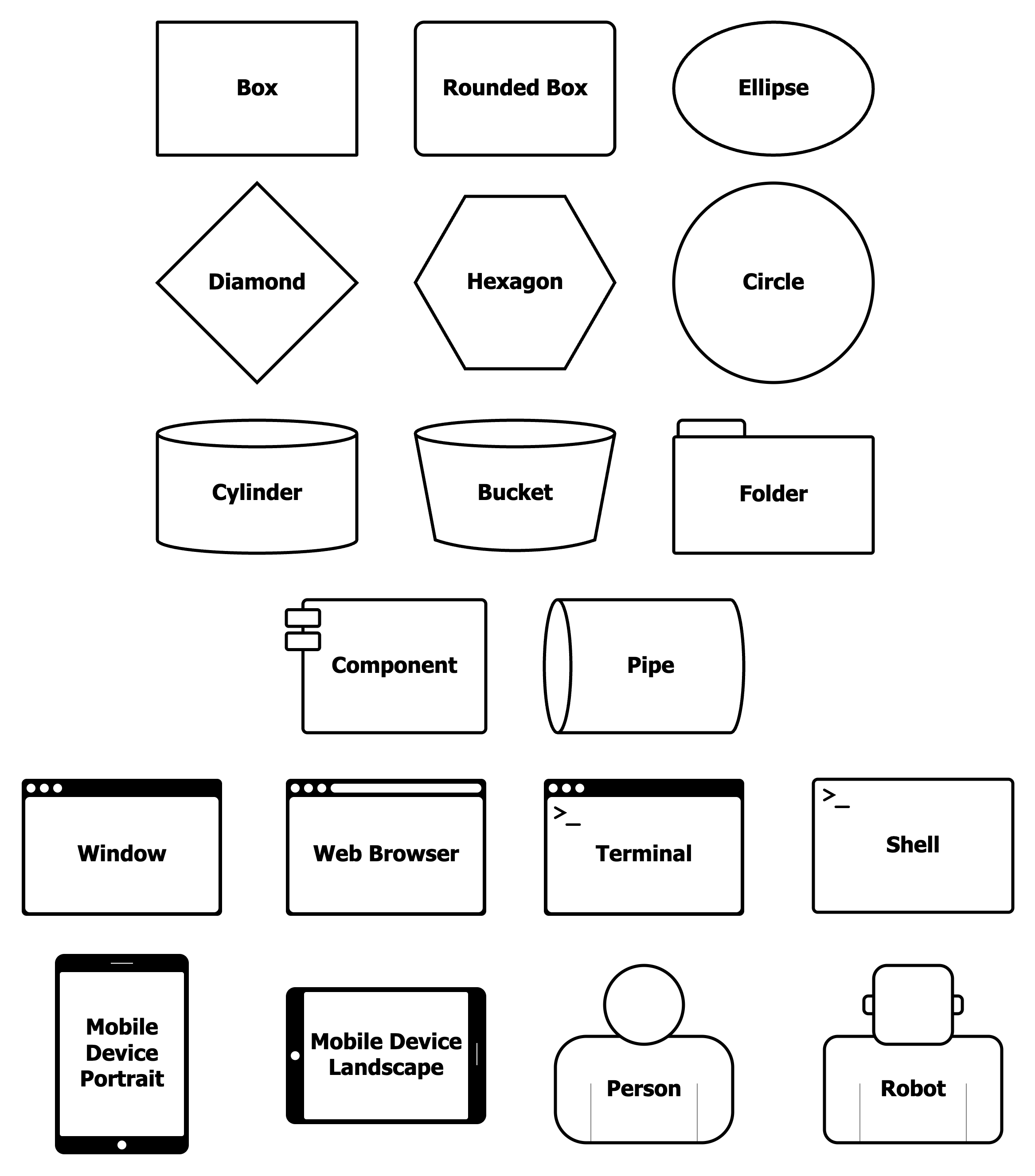 | Person | Software System | Container | Component | Deployment Node | Infrastructure Node | Boundary | Group | |